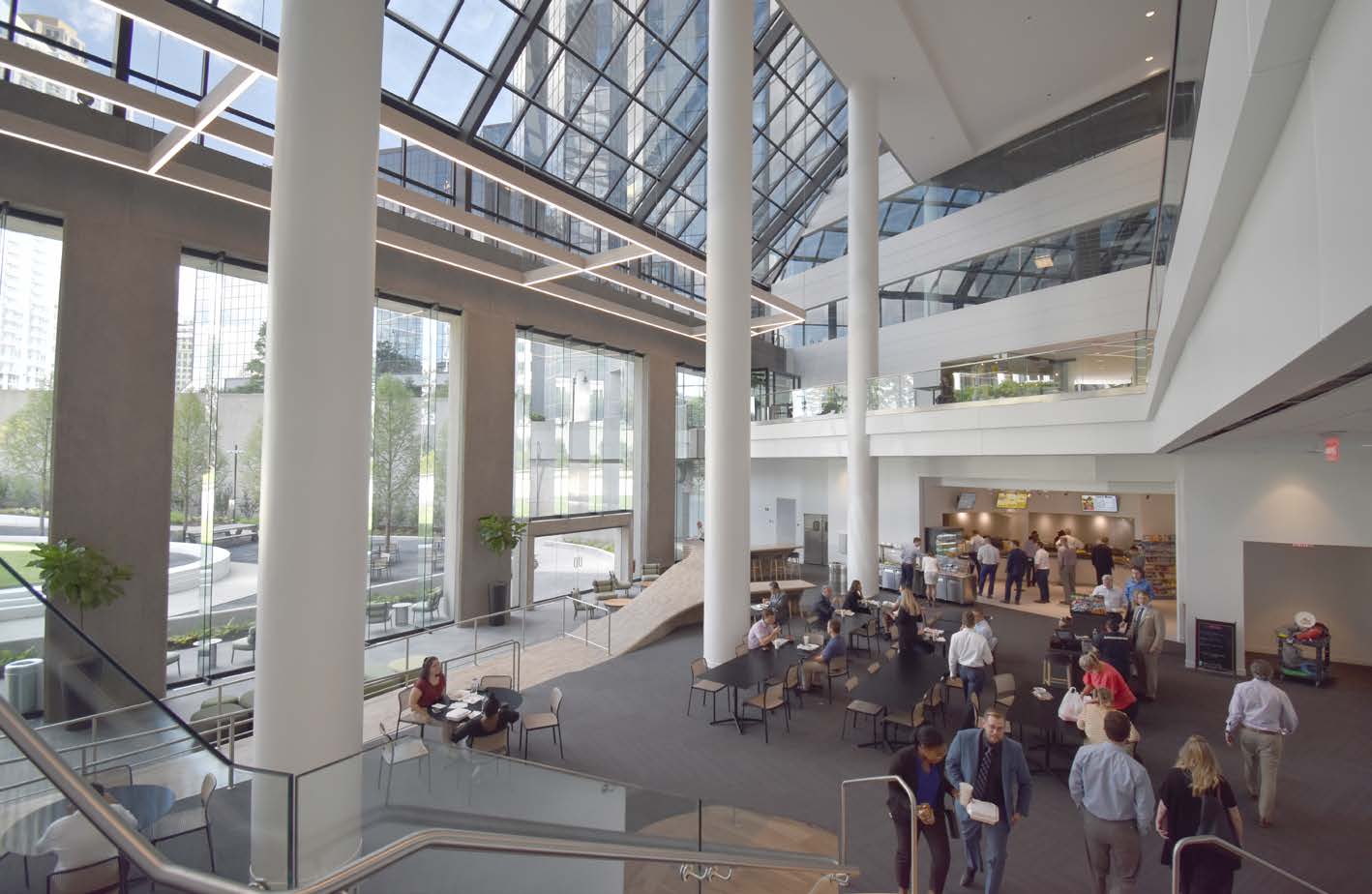 The central atrium serves as a welcoming hub for the campus, offering comfortable lounge seating, access to the on-site café, and a natural gathering space for tenants and guests. The atrium connects interior spaces to AFC Park and provides a relaxed yet refined setting for casual meetings and daily use.