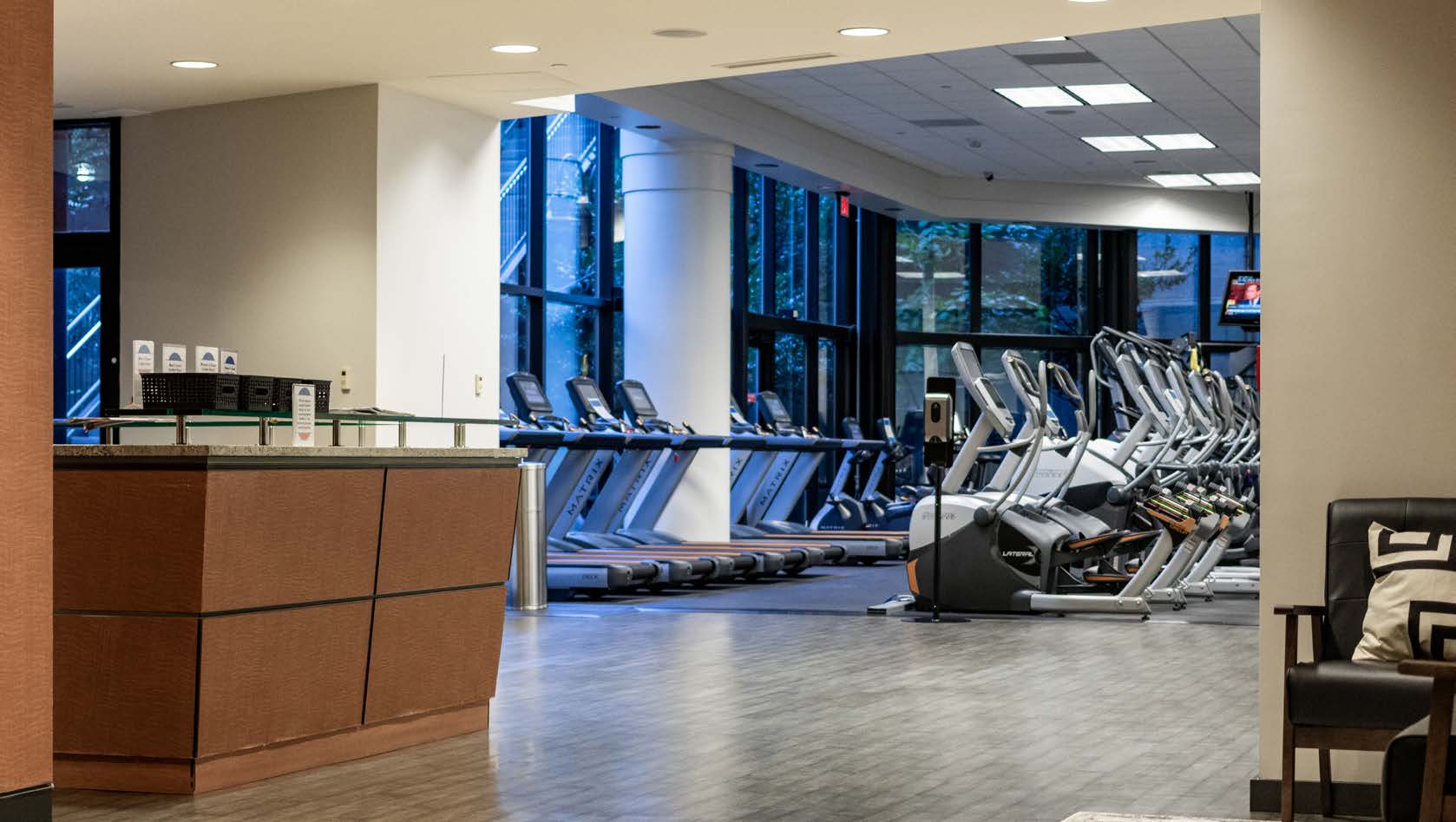 A high-end fitness facility available to tenant employees, featuring modern cardio and strength equipment, functional training areas, and locker room amenities. The space supports wellness and routine movement as part of the workday, with additional services including group classes and personal training.